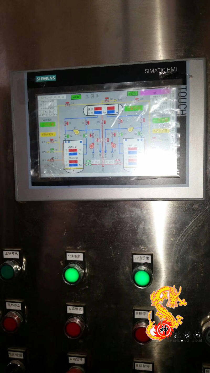 4.整个杀菌过程采用PLC全自动控制,釜内热分布温度控制在±0.5℃内,可多阶段加热,节约能源;配有F值测量功能;可存储100个杀菌公式;